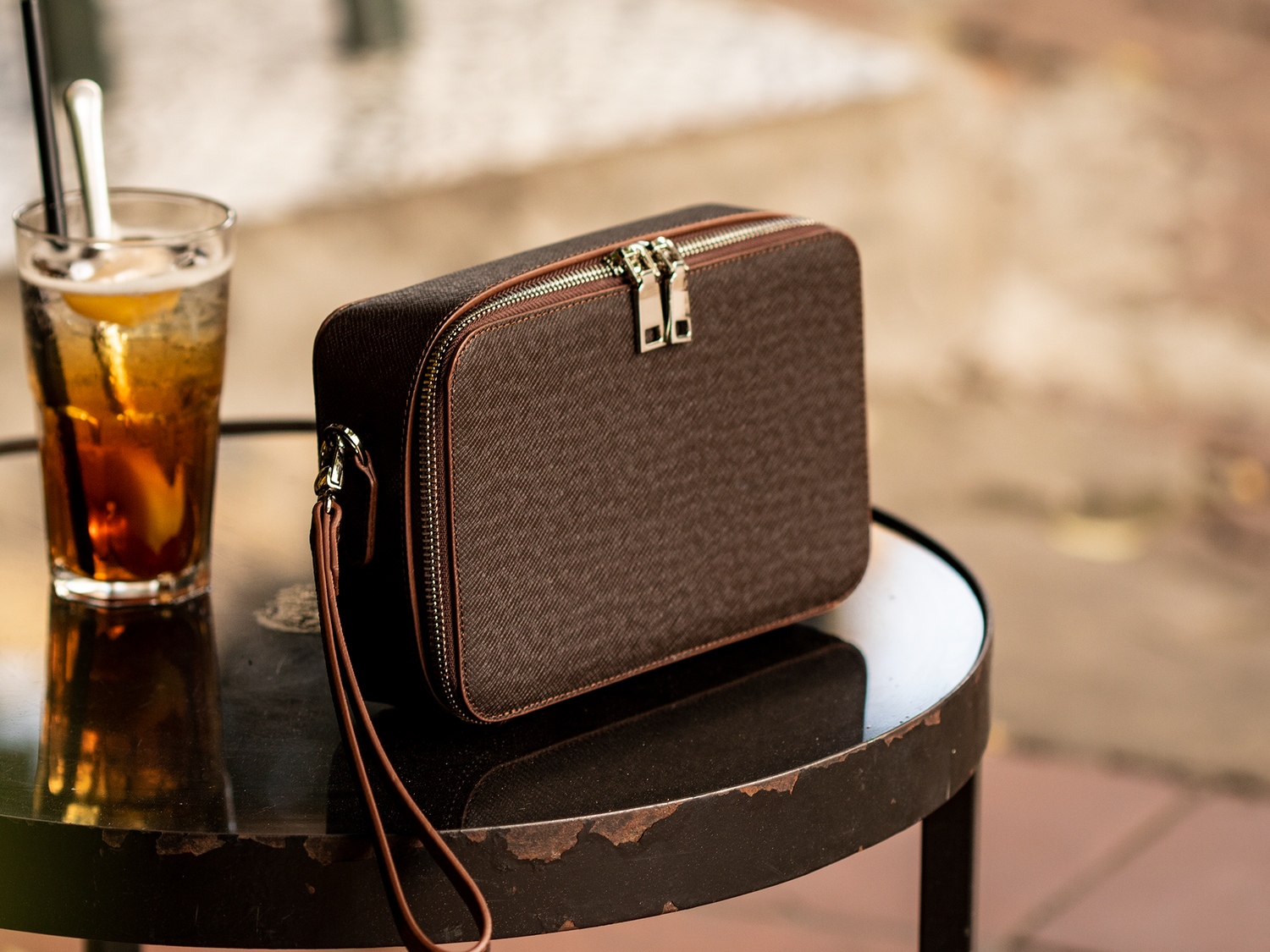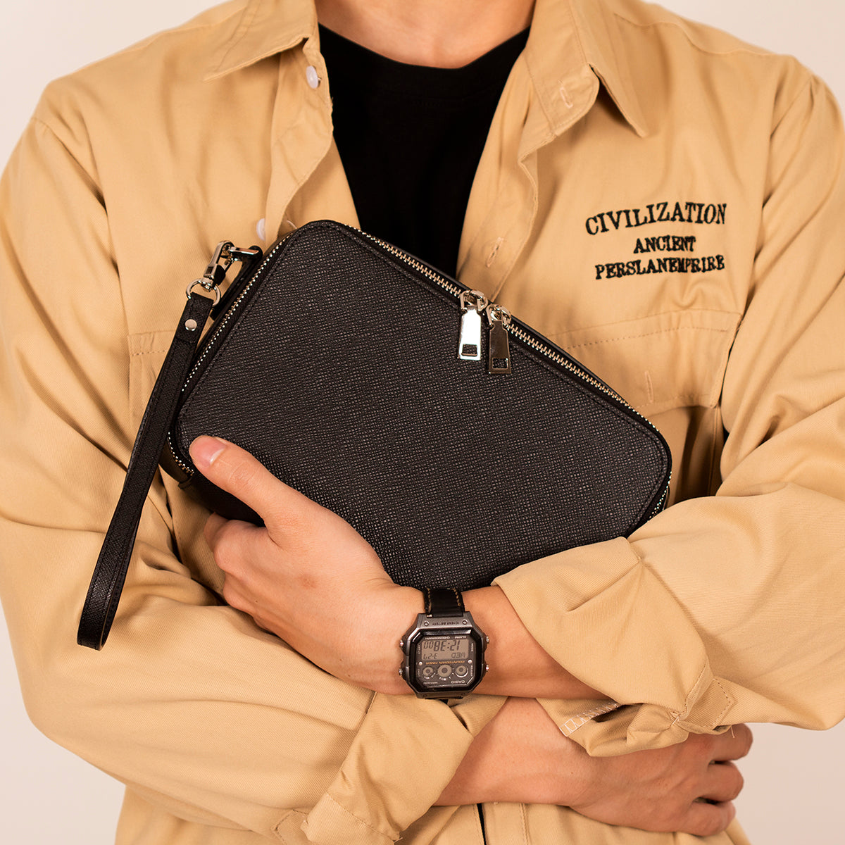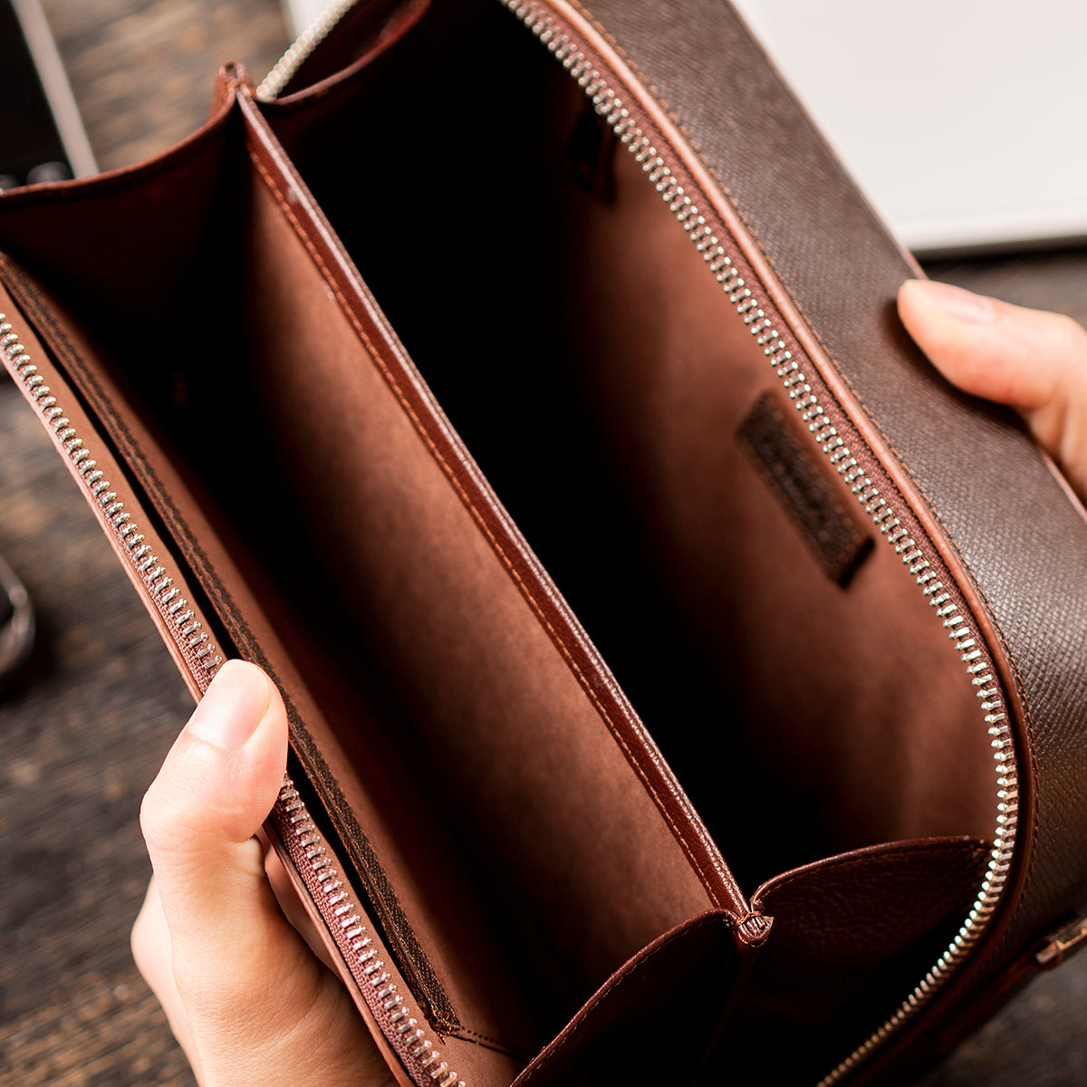 The clutch is made from imported Taiga leather, known for its durability and premium quality.